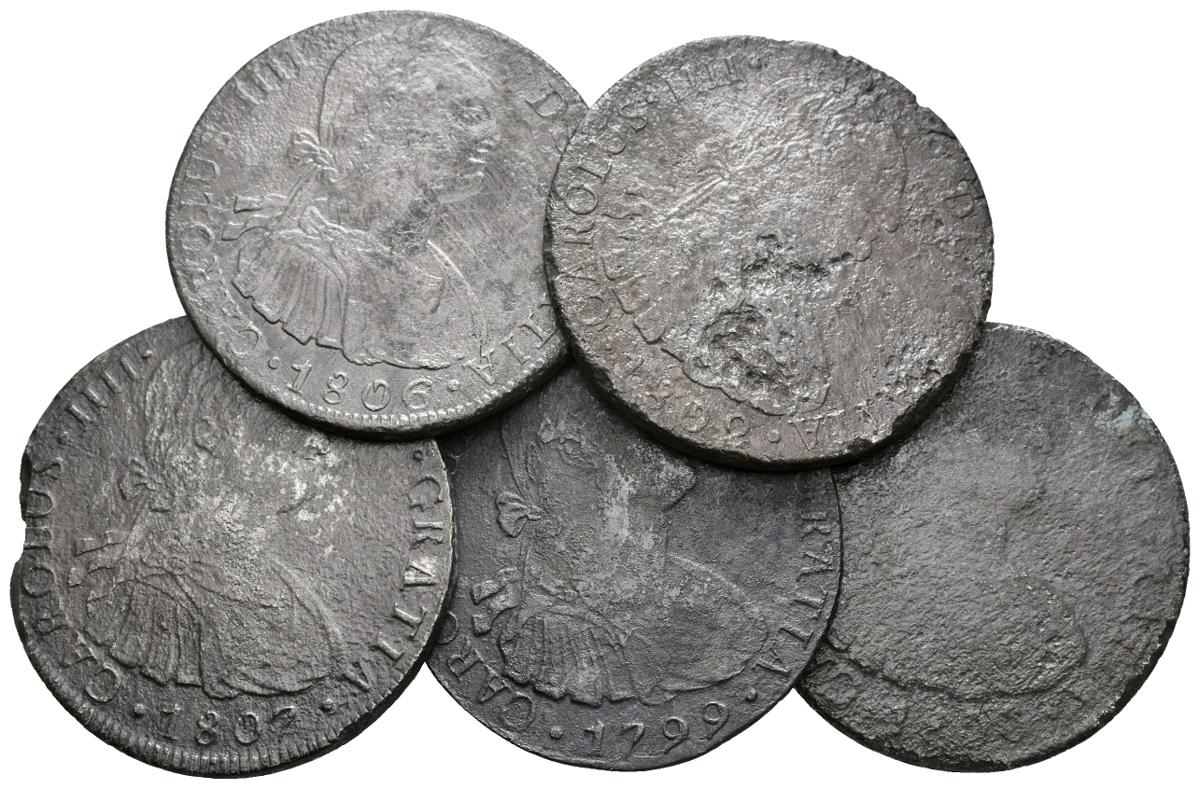 CARLOS IV. Lote compuesto por 5 monedas de 8 Reales: 1799 Lima IJ, 1800 Lima IJ, 1802 Lima IJ, 1806 Lima JP y 1807 Lima JP. Todas con oxidaciones marinas. Ar. BC+/MBC-. A EXAMINAR.
