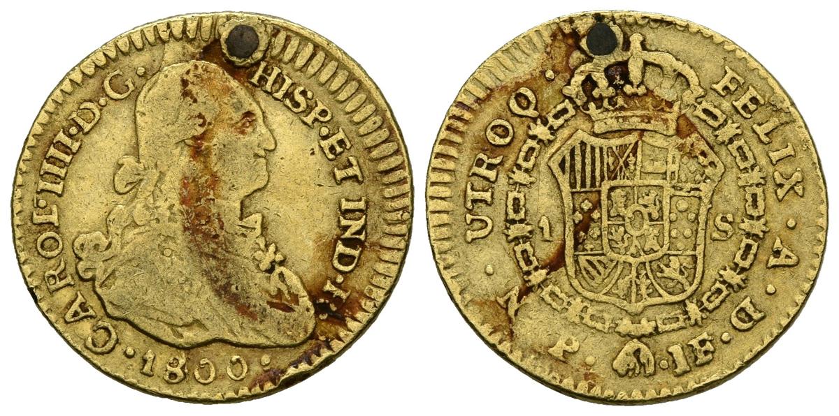CARLOS IV (1788-1808). 1 Escudo. (Au. 3,33g/19mm). 1800. Popayán JF. (Cal-2019-1159). BC. Perforación tapada.