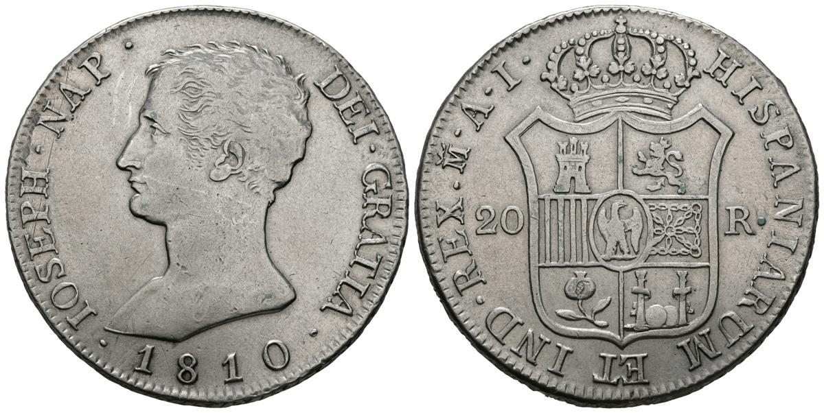 JOSE NAPOLEON (1808-1813). 20 Reales. (Ar. 26,82g/40mm). 1810. Madrid AI. (Cal-2019-37). Aguila pequeña. MBC.