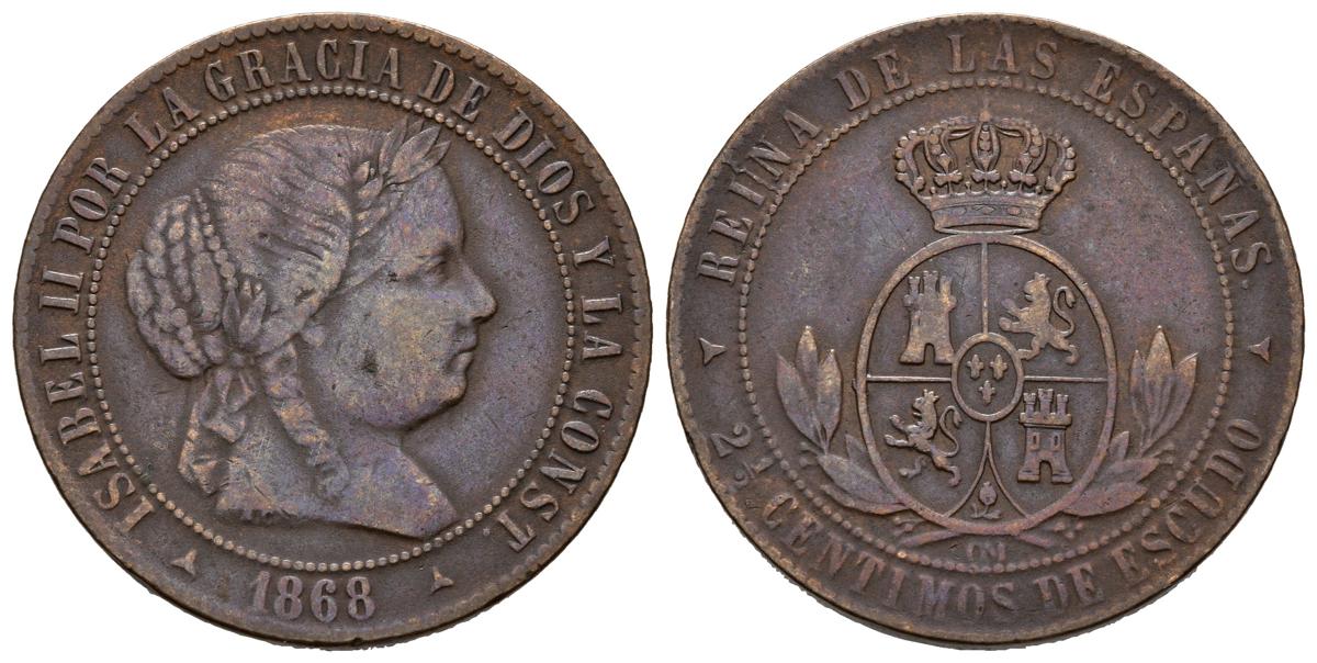 ISABEL II (1833-1868). 2 1/2 Céntimos de Escudo. (Ae. 6,08g/25mm). 1868. Jubia. (Cal-2019-237). MBC. Preciosa pátina irisada.