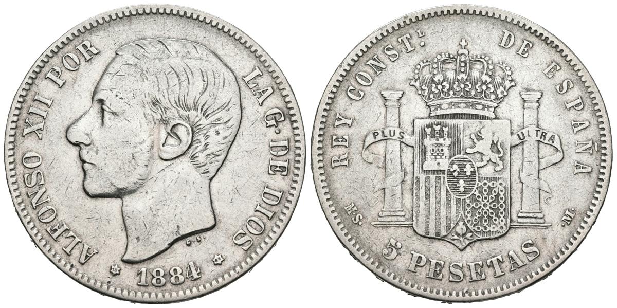 ALFONSO XII (1874-1885). 5 Pesetas. (Ar. 24,73g/37mm). 1884 *18-84. Madrid MSM. (Cal-2019-57). MBC-.