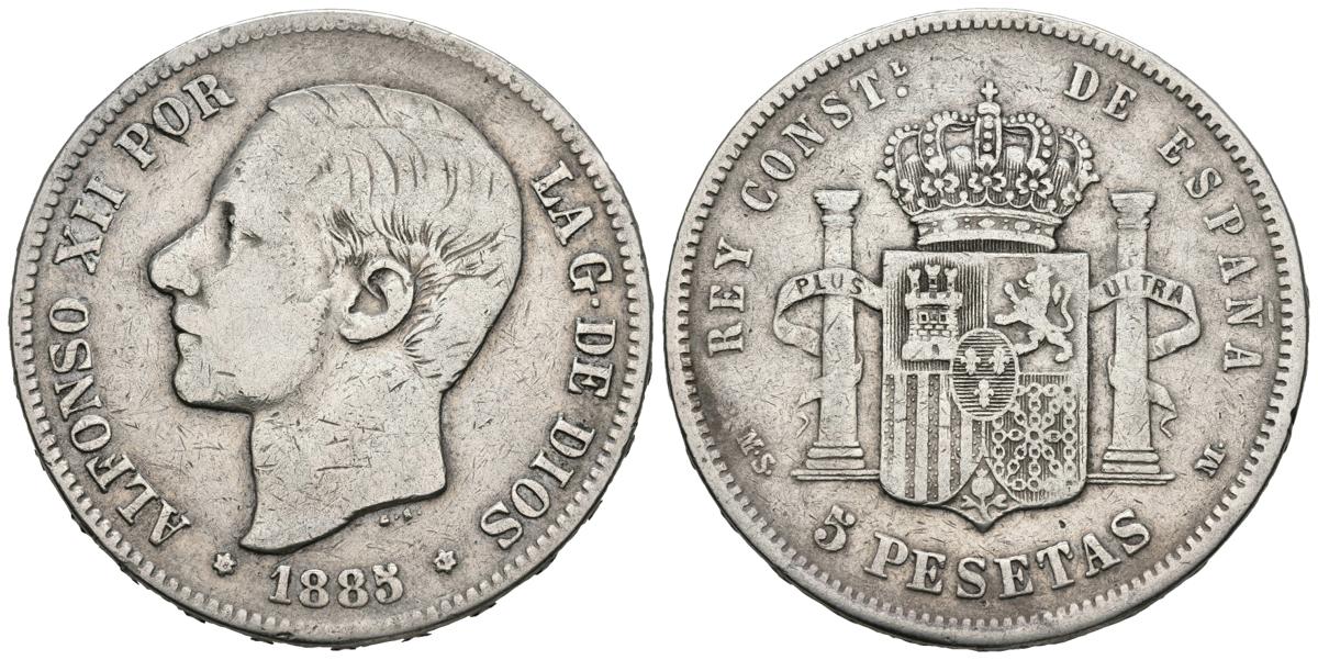 ALFONSO XII (1874-1885). 5 Pesetas. (Ar. 24,44g/38mm). 1885 *18-85. Madrid MSM. (Cal-2019-60). MBC-.