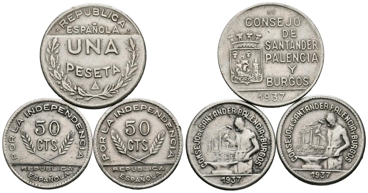 CONSEJO DE SANTANDER, PALENCIA Y BURGOS. Serie completa de esta serie formada por dos piezas de 50 Céntimos (con y sin PJR) y 1 Peseta. Diferentes estados de conservación. MBC+.