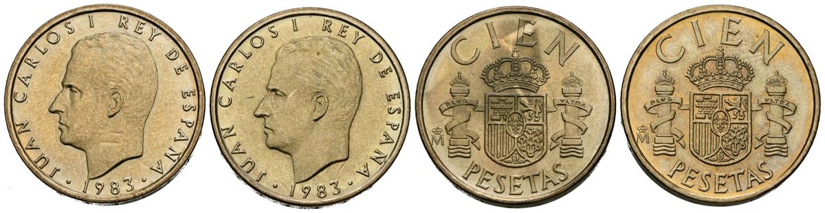 JUAN CARLOS I. Pareja de 2 monedas de 100 Pesetas de 1983. Flor de lis arriba y abajo. SC.
