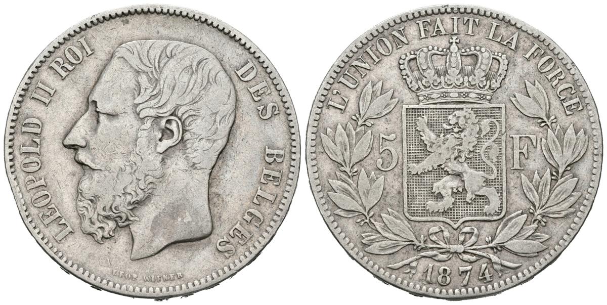 BELGICA. 5 Francs. (Ar. 24,75g/37mm).1874. (Km#24). MBC.