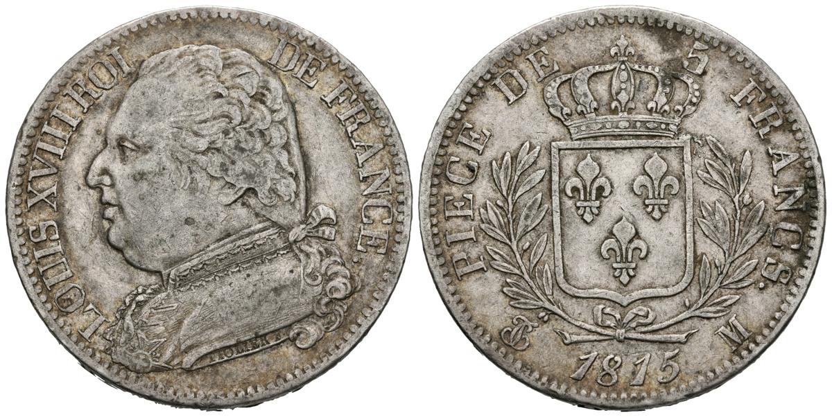 FRANCIA. 5 Francs. (Ar. 24,84g/37mm). 1815. Toulouse M. (Km#702.9). MBC+.