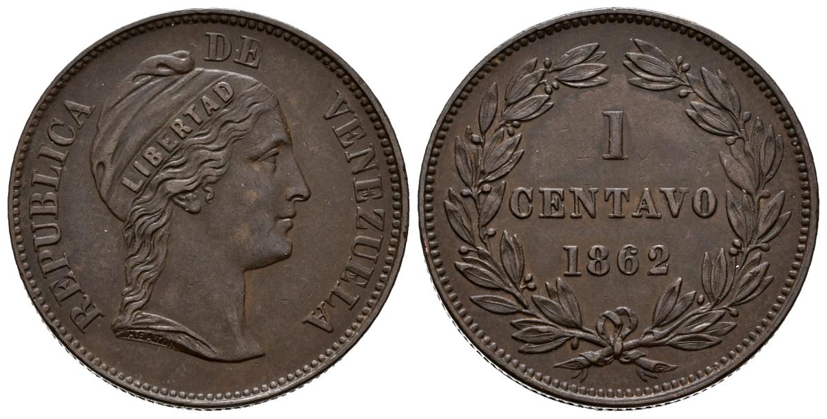 REPUBLICA DE VENEZUELA. 1 Centavo (Ae. 7,50g/26mm). 1862. Birmingham. (Km#Y7). Heaton debajo del busto. EBC.