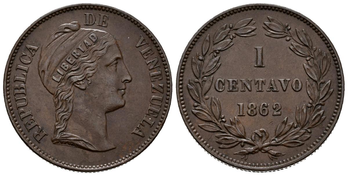 REPUBLICA DE VENEZUELA. 1 Centavo. (Ae. 7,51g/26mm). 1862. Birmingham. (Km#Y7). Heaton debajo del busto. EBC-.
