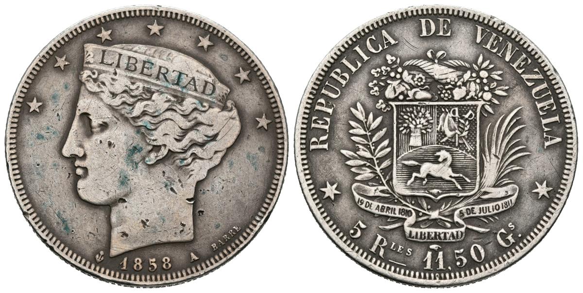 REPUBLICA DE VENEZUELA. 5 Reales (Ar. 11,30g/30mm). 1858. París. (Km#Y11). MBC-. Manchas en el anverso.
