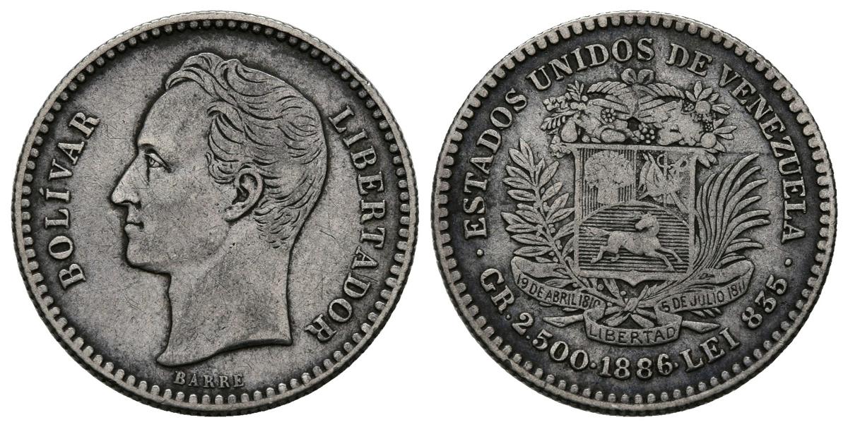 ESTADOS UNIDOS DE VENEZUELA. 1/2 Bolívar (Ar. 2,45g/18mm). 1886. París. (Km#Y21). MBC. Bonita pátina oscura.