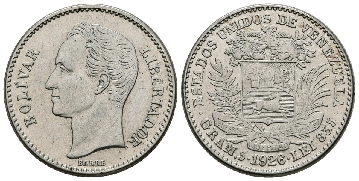 ESTADOS UNIDOS DE VENEZUELA. 1 Bolívar (Ar. 5,00g/28mm). 1926. Philadelphia. (Km#Y22). EBC.