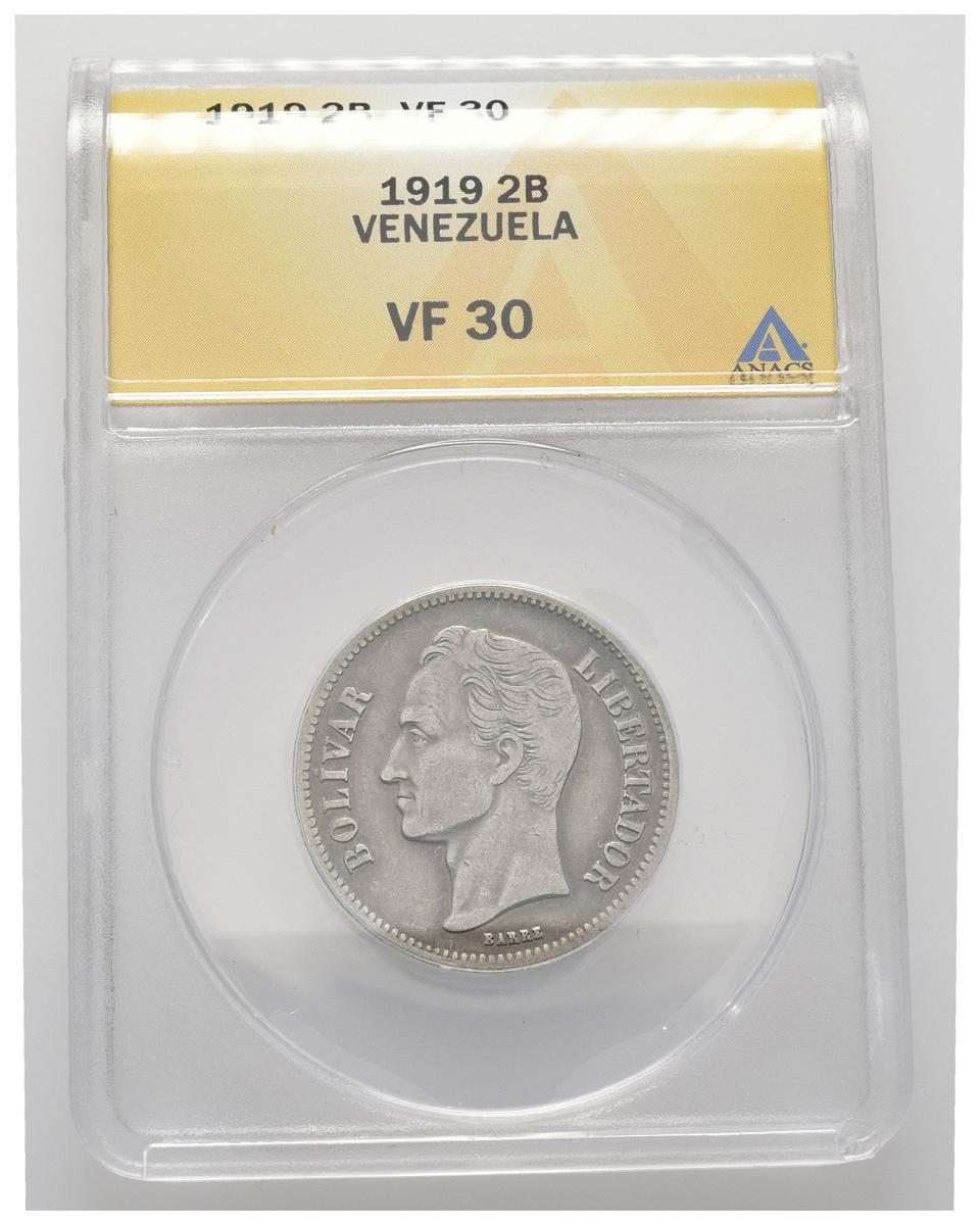 ESTADOS UNIDOS DE VENEZUELA. 2 Bolívares. (Ar. 10,00g/27mm). 1919. Philadelphia. (Km#Y23). Encapsulado ANACS VF-30.