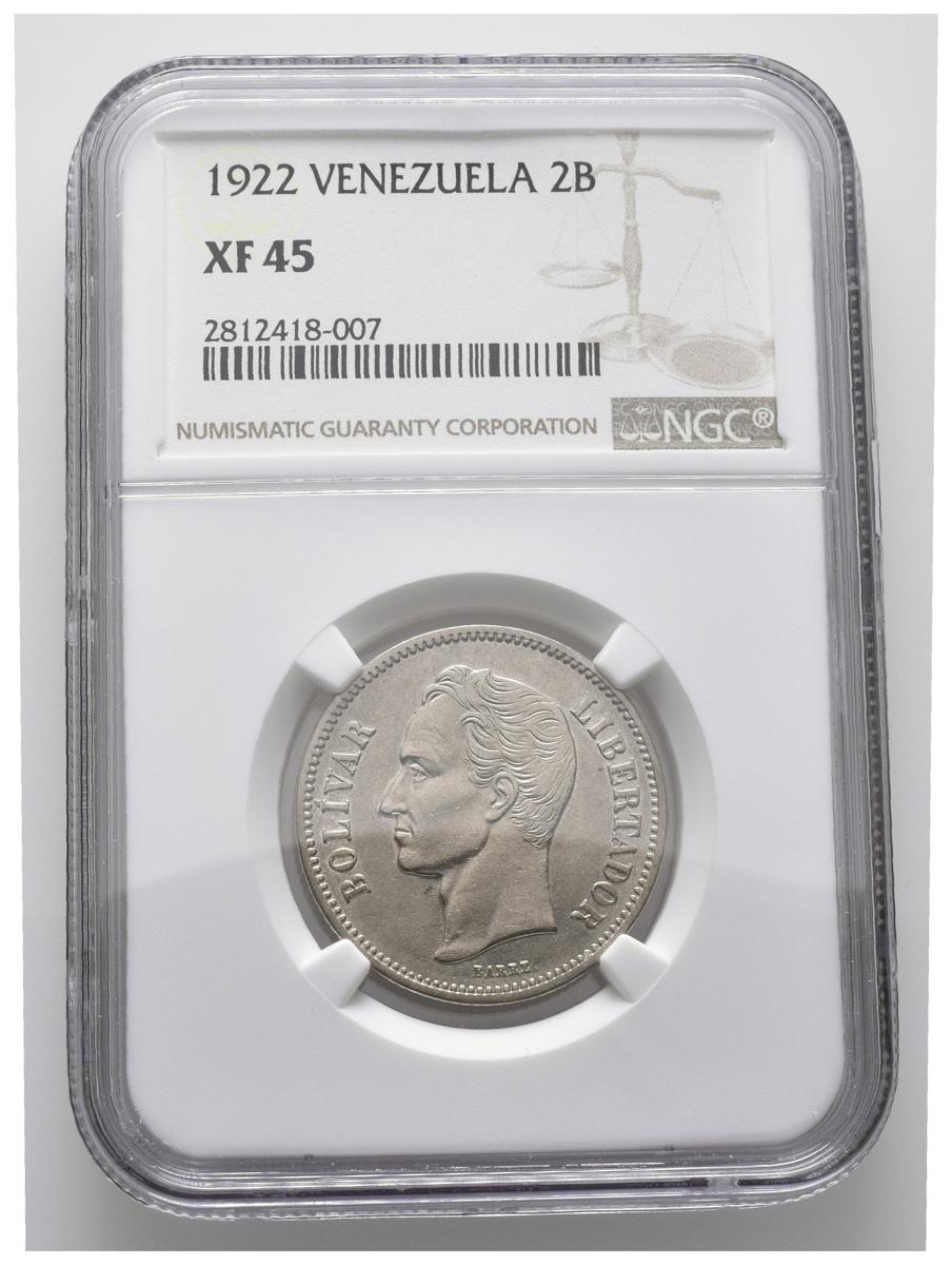 ESTADOS UNIDOS DE VENEZUELA. 2 Bolívares. (Ar. 10,00g/27mm). 1922. Philadelphia. (Km#Y23). Encapsulado NGC XF-45.