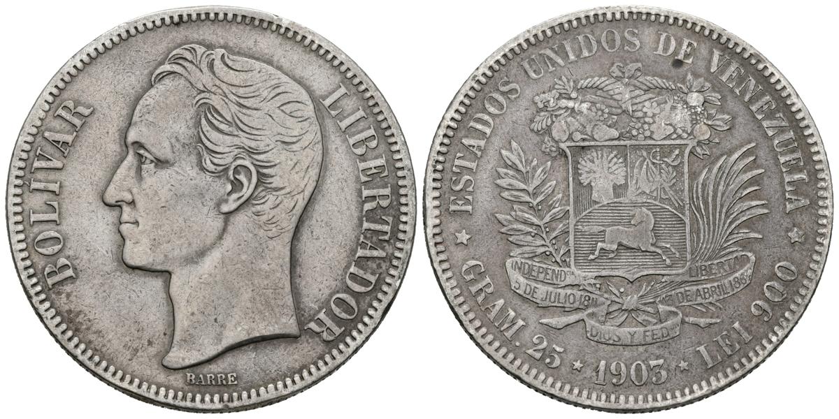 ESTADOS UNIDOS DE VENEZUELA. 5 Bolívares. (Ar. 24,72g/37mm). 1903. (Km#Y24.2). MBC+.
