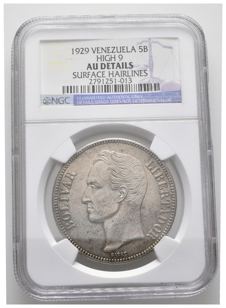 ESTADOS UNIDOS DE VENEZUELA. 5 Bolívares. (Ar. 25,00g/37mm). 1929. Philadelphia. (Km#Y24.2). Variante 9 alto. Encapsulado NGC AU Details. Rayitas.