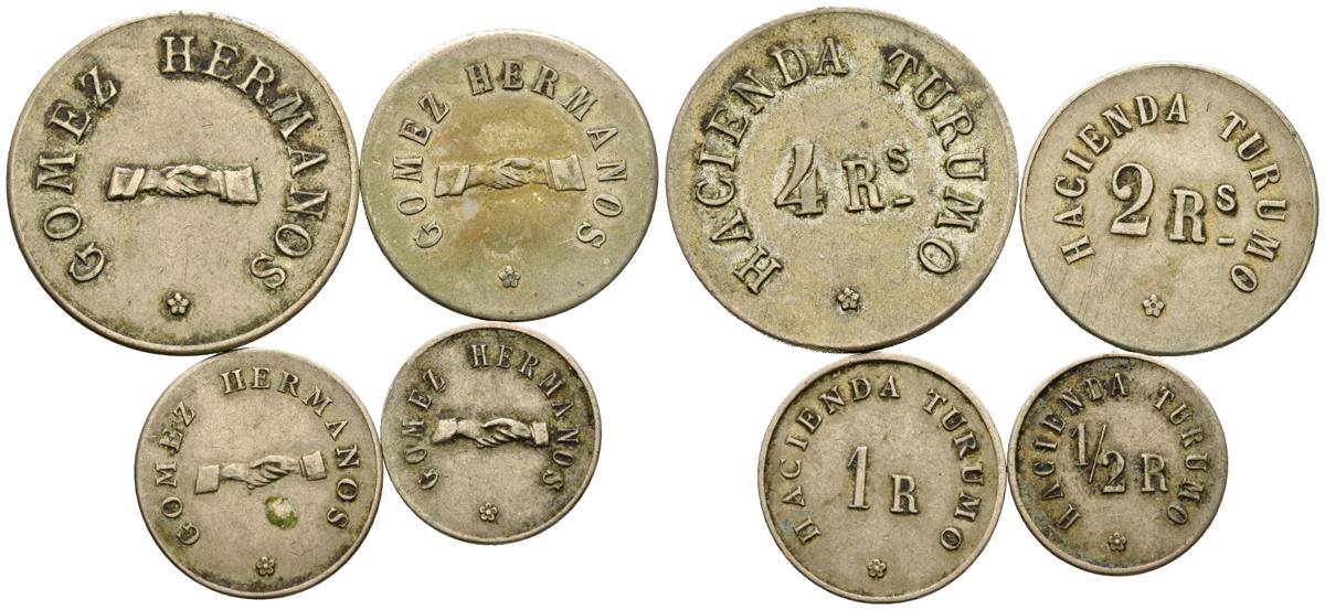 ESTADOS UNIDOS DE VENEZUELA. 4 fichas de 4 valores nominales diferentes: 4,2, 1 y 1/2 Reales. Finales del siglo XIX- Principios del siglo XX. Hacienda Turumo, Hermanos Gomez. Estado de Miranda, Gran Caracas. MBC.
