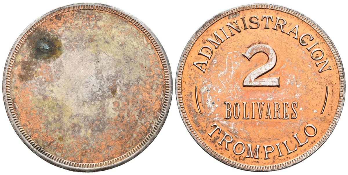 ESTADOS UNIDOS DE VENEZUELA. Ficha con valor nóminal de 2 Bolívares. Primer tercio del siglo XX. (Cu. 12,30g/35mm). Administración Trompillo. Código Registro de las Fichas de Venezuela del Arquitecto Humberto Bermúdez L. (T-130.3). MBC-.