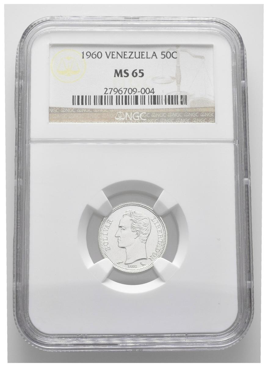 REPÚBLICA DE VENEZUELA. 1/2 Bolívar. (Ar. 2,50g/18mm). 1960. Philadelphia. (Km#Y36a). Encapsulado NGC MS-65.