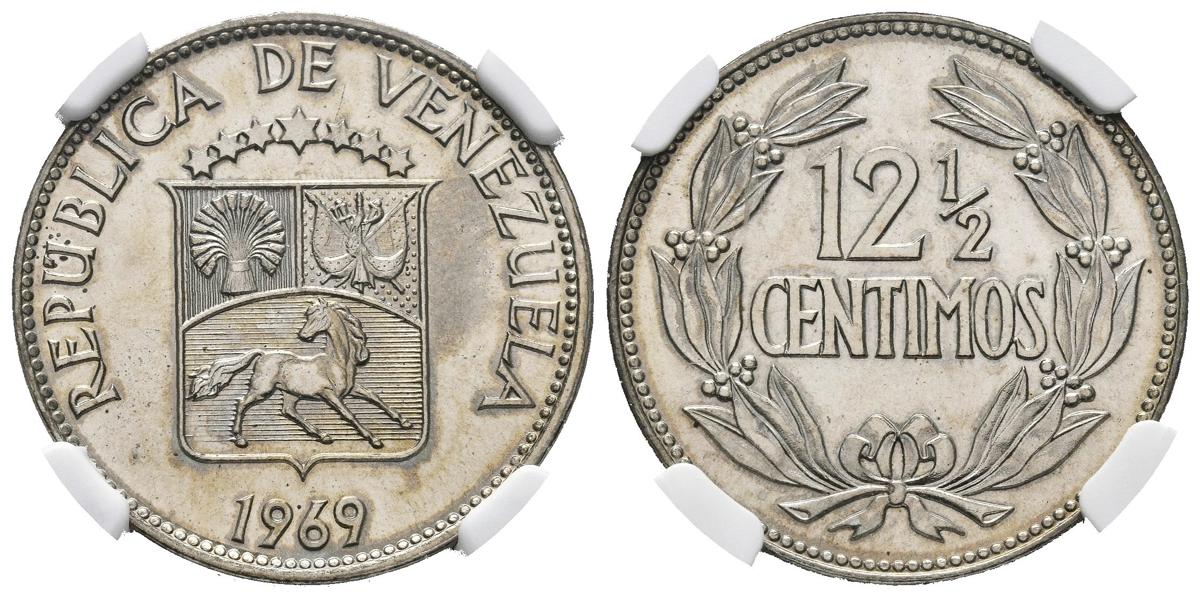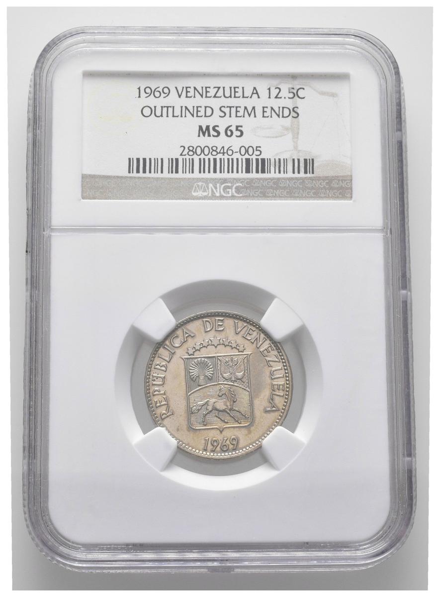 REPÚBLICA DE VENEZUELA. 12 1/2 Céntimos. (CuNi. 5,00g/23mm). 1969. Madrid. (Km#Y39.2). Variante "OUTLINED STEM ENDS" (extremo del tallo remarcado). Encapsulado NGC MS-65.