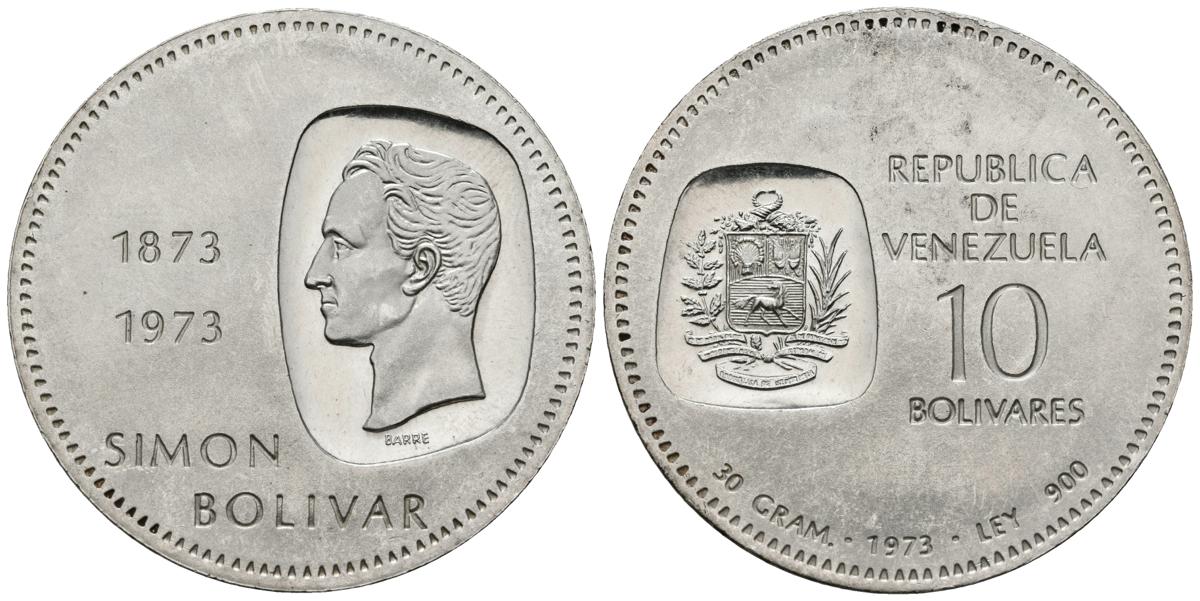 REPÚBLICA DE VENEZUELA. 10 Bolívares. (Ar. 29,80g/39mm). 1973. Centenario de la efigie de Simón Bolívar en la moneda (1873-1973)(Km#Y45). EBC+.