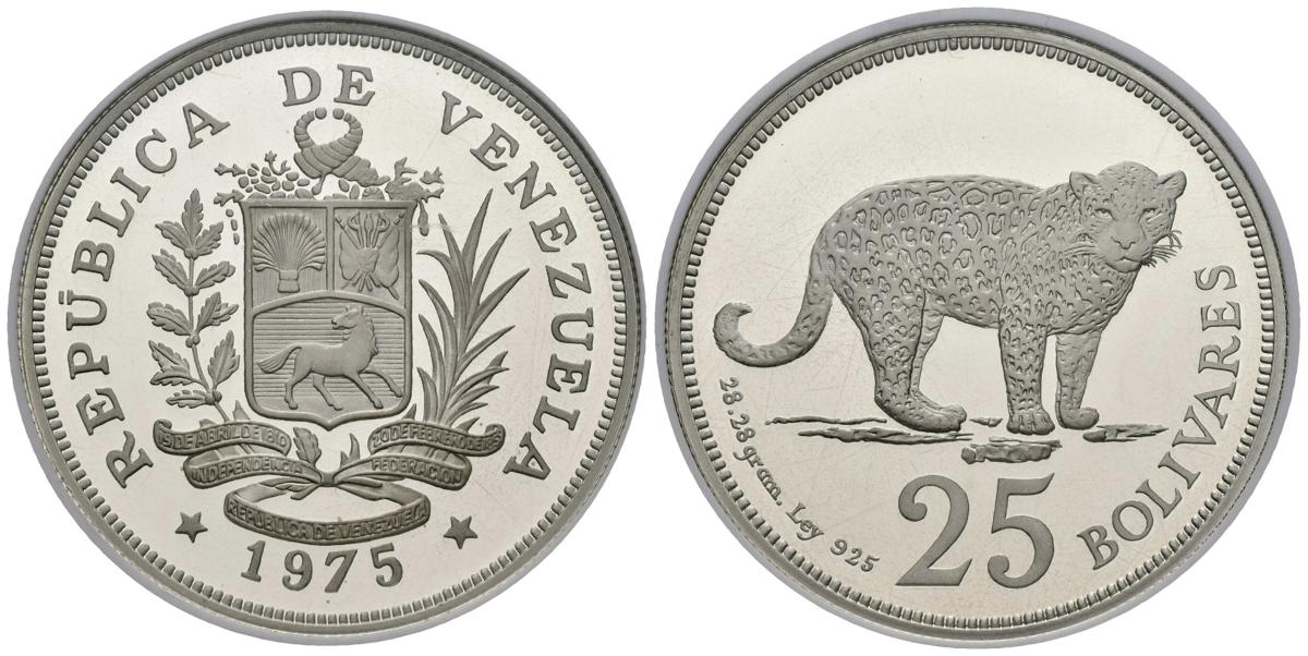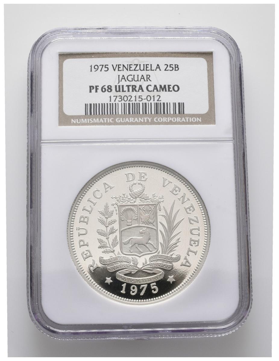 REPÚBLICA DE VENEZUELA. 25 Bolívares. (Ar. 28,70g/38mm). 1975. Londres. (Km#Y46). Encapsulado NGC PF-68 ULTRA CAMEO.