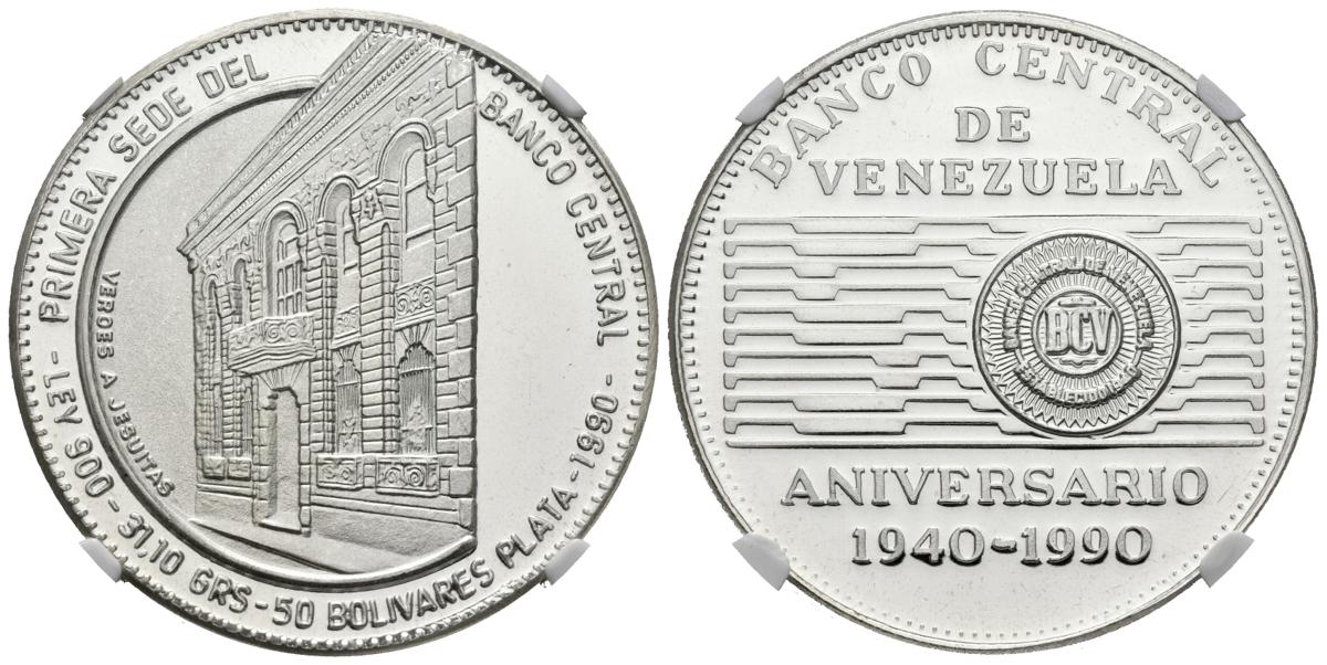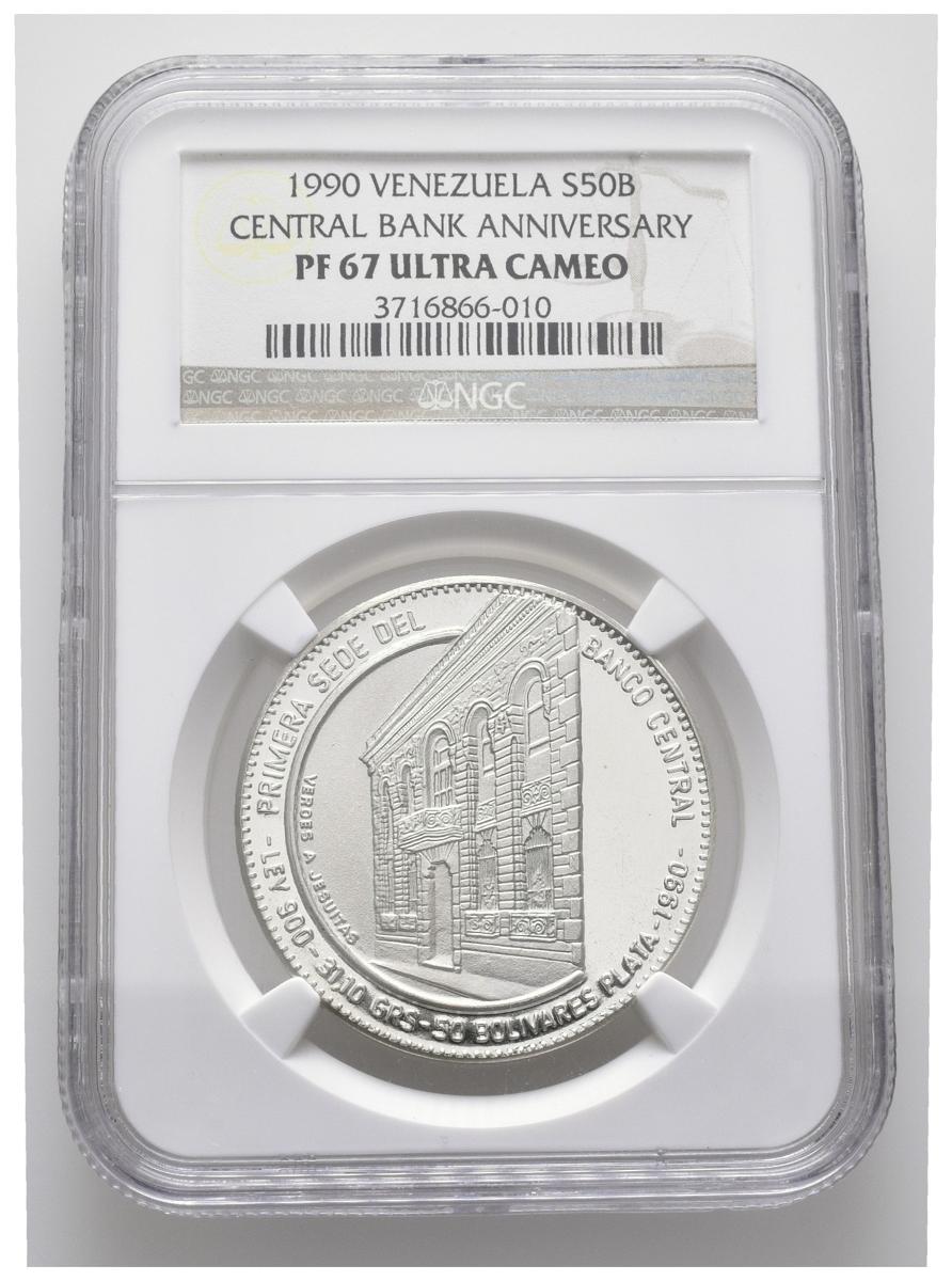 REPÚBLICA DE VENEZUELA. 50 Bolívares. (Ar. 31,10g/35mm). 1990. 50 Aniversario de la primera sede del Banco Central. (Km#Y66). Encapsulado NGCPF-67 ULTRA CAMEO.