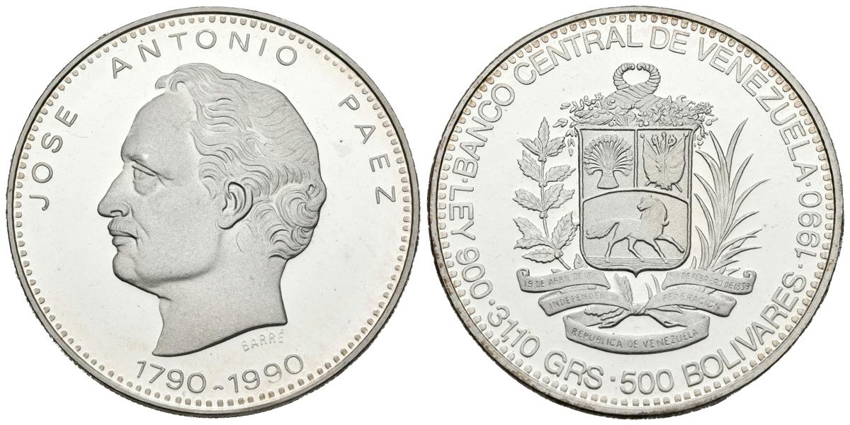 REPÚBLICA DE VENEZUELA. 500 Bolívares. (Ar. 31,10g/35mm). 1990. José Antonio Paez (1760-1990). (Km#Y64). SC-.