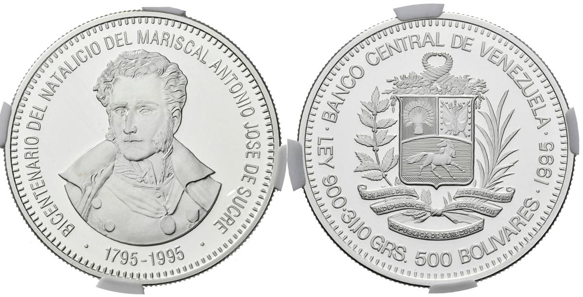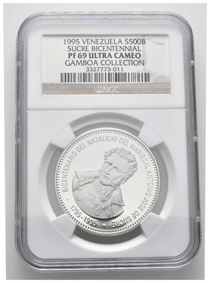 REPÚBLICA DE VENEZUELA. 500 Bolívares. (Ar. 31,10g/35mm). 1995. Bicentenario del nacimiento de Antonio José de Sucre. (Km#Y72). Encapsulado NGC PF-69 ULTRA CAMEO. Ex Colección Gamboa.