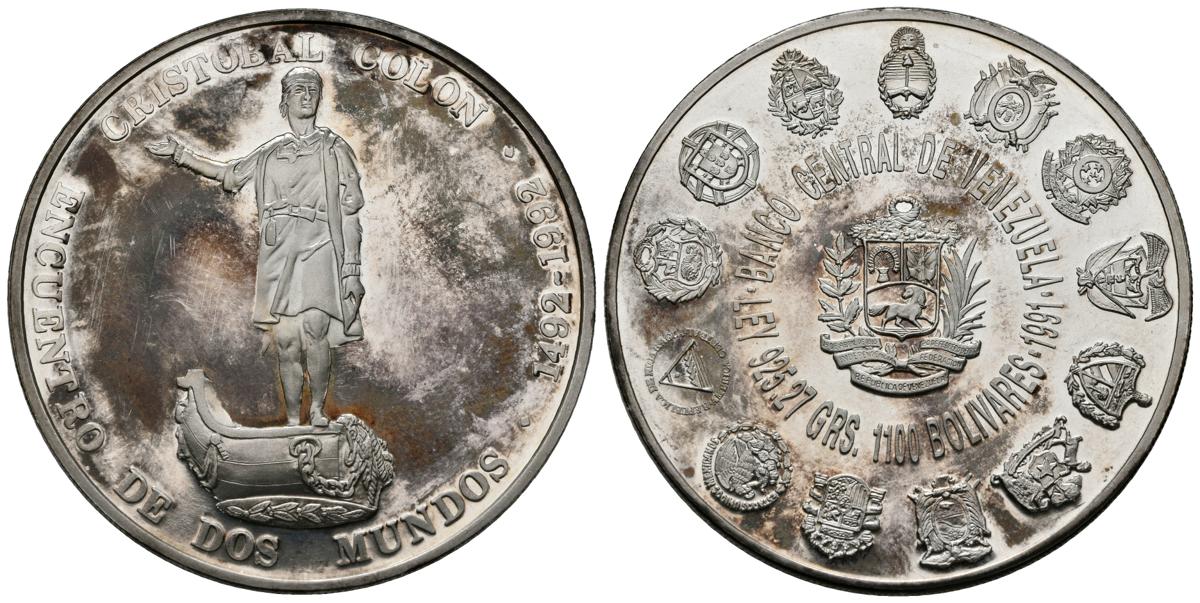 VENEZUELA. 1100 Bolívares (Ar. 27,11g/45mm). 1991. Serie Iberoamericana. (Km#Y68). PROOF. Manchas. Sólo 10.000 ejemplares acuñados.