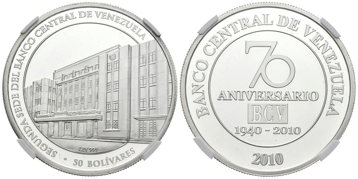 REPÚBLICA BOLIVARIANA DE VENEZUELA. 50 Bolívares. 2010. (Ar. 31,10g/38mm). 2010. 70 Aniversario del Banco Central de Venezuela. (Km#Y101). Encapsulado NGC PF-67 ULTRA CAMEO.