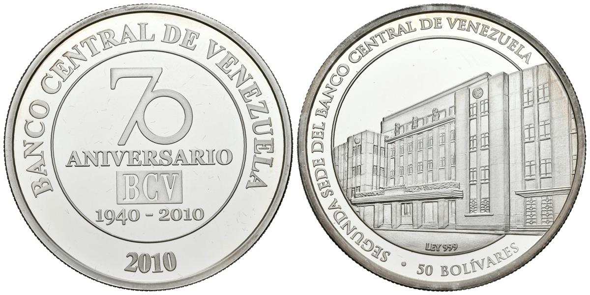 REPÚBLICA BOLIVARIANA DE VENEZUELA. 50 Bolívares. (Ar. 31,10g/38mm). 2010. 70 Aniversario del Banco Central de Venezuela. (Km#Y101). PROOF.