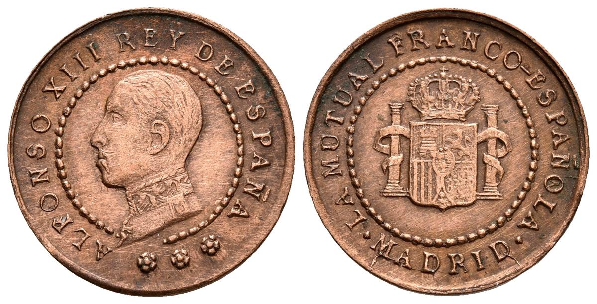 La Mutual Franco-Española. (Ae. 1,64g/18mm). Madrid. Reinado de Alfonso XII ( 1885-1931). MBC+.