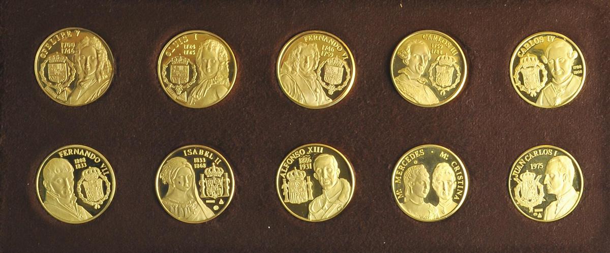MEDALLAS. Estuche completo compuesto por 10 medallas conmemorativas de los Reyes de España de oro 0,917 milésimas. (Peso total: 118,50g). PROOF.
