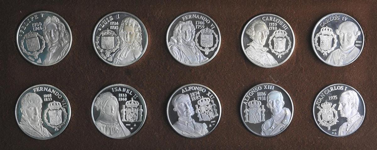 MEDALLAS. Estuche completo compuesto por 10 medallas conmemorativas de los Reyes de España de oro 1 milésima. (Peso total: 298,12g). PROOF.