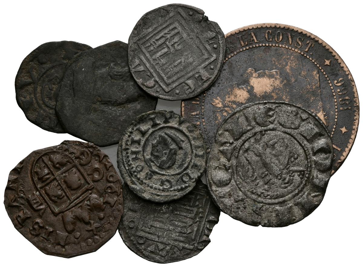 EPOCA MEDIEVAL y MONARQUIA ESPAÑOLA. Conjunto de 8 monedas de diferentes valores y reyes españoles. A EXAMINAR.