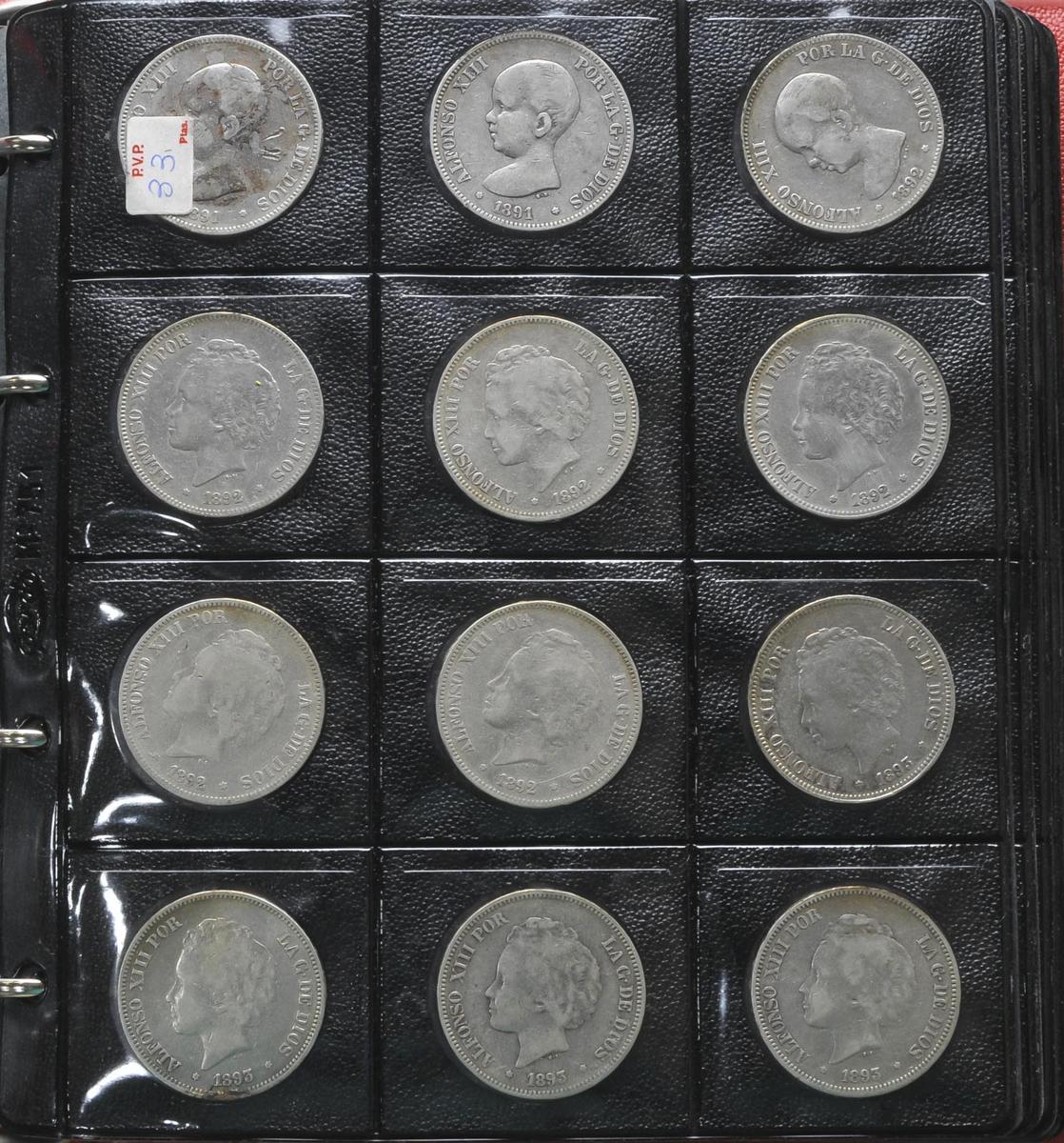 CENTENARIO DE LA PESETA. Interesantísima colección para la iniciación en la nusmimática, comprendiedo más de 300 monedas desde el Gobierno Provisional hasta Alfonso XIII, de 5 Pesetas a 50 Céntimos, destacando 5 Pesetas de 1893 y 1897. Calidad media de la colección MBC+/MBC. Imprescindible examen de la colección (para mayor información le rogamos revise el PDF dónde encontrará fotografiada a gran resolución todas las monedas de la colección).