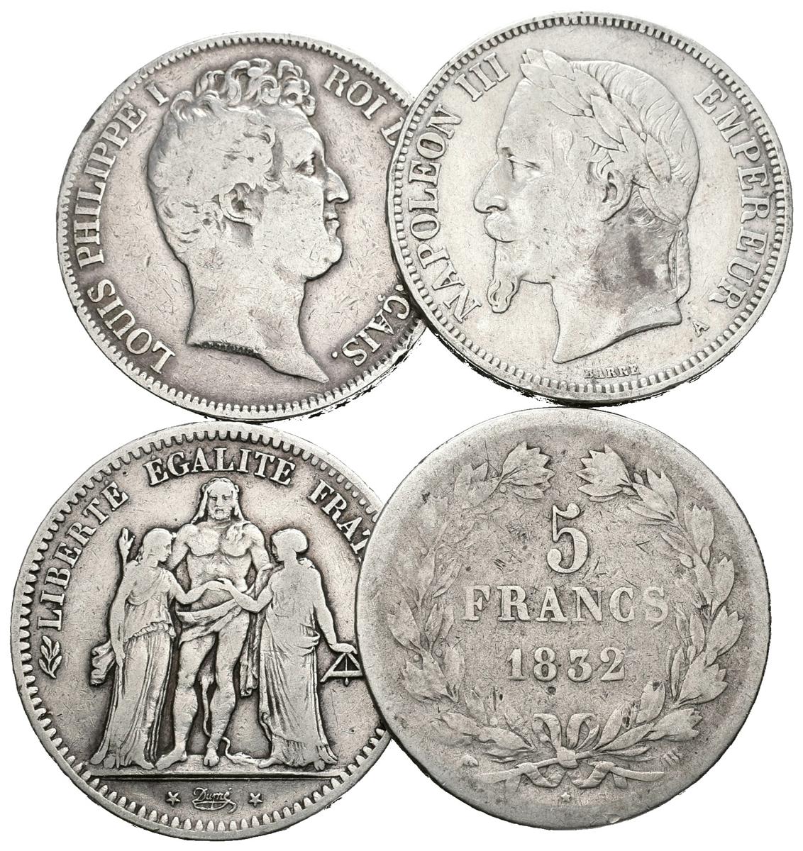 FRANCIA. Conjunto de 4 monedas de 5 Francs de plata de fechas comprendidas 1831 y 1870. Diferentes estados de conservación. A EXAMINAR.