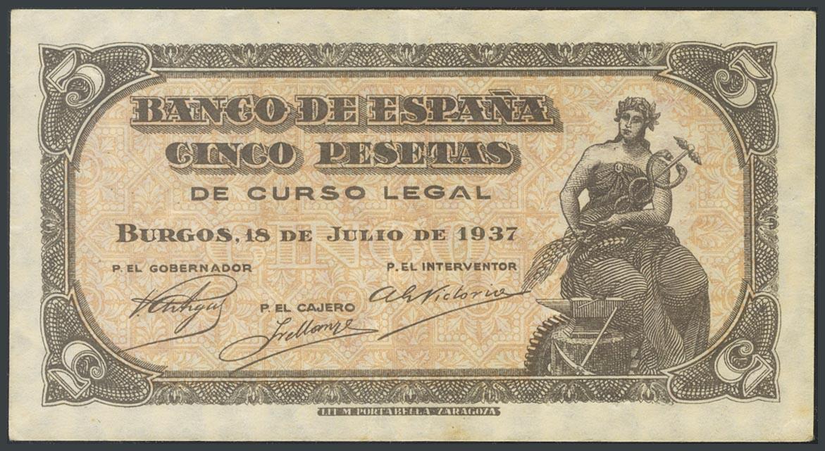 5 Pesetas. 18 de Julio de 1937. Serie B. (Edifil 2017: 424a). EBC.