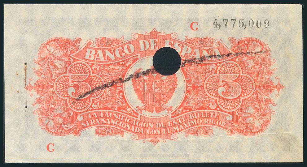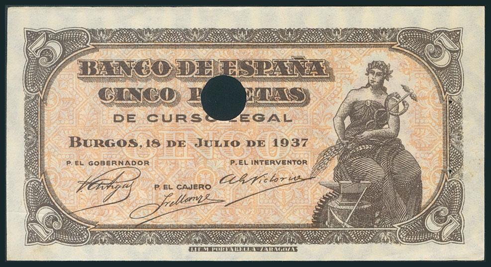 5 Pesetas. 18 de Julio de 1937. Serie C. Taladrado y con puntos de grapa. (Edifil 2017: 424a). EBC+.