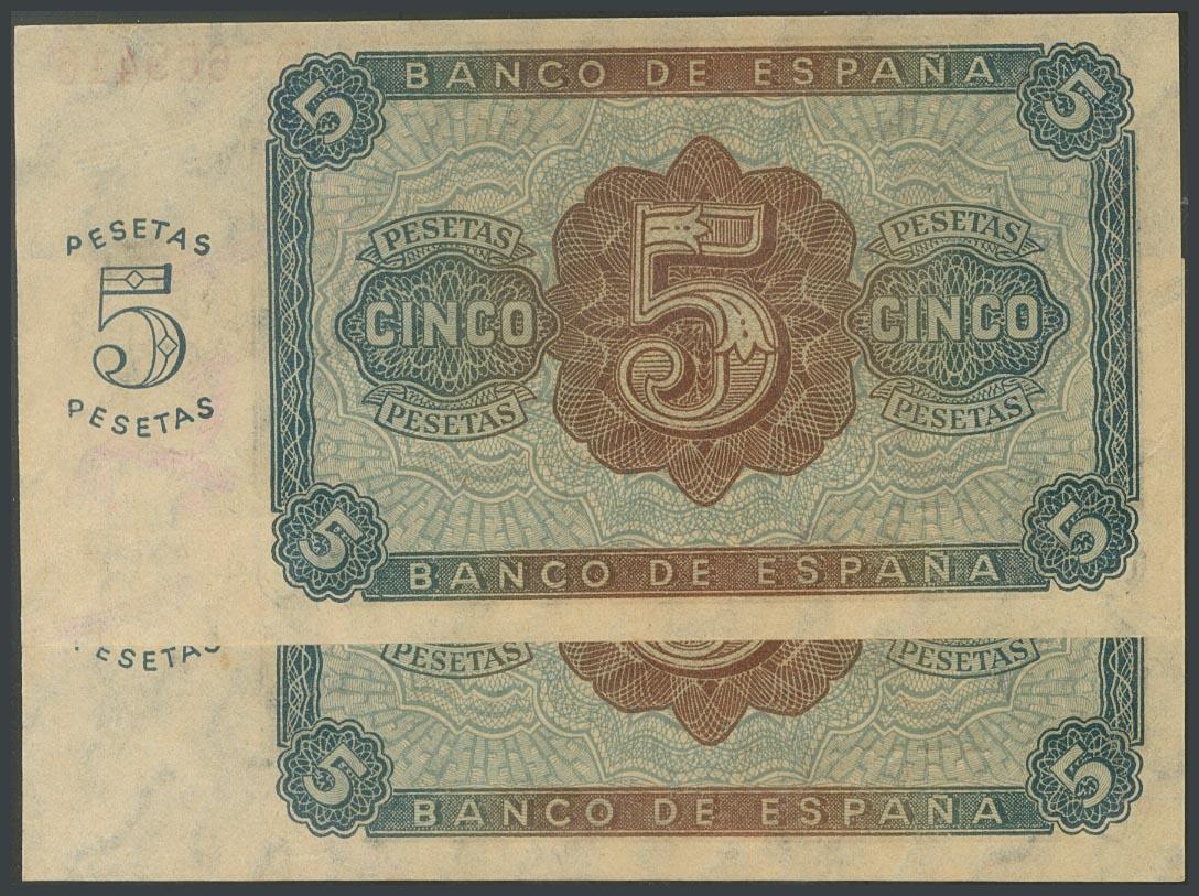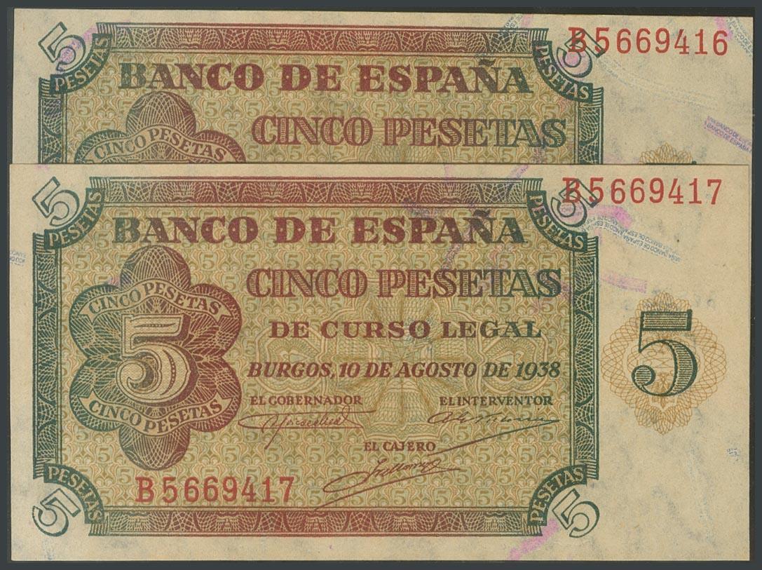 5 Pesetas. 10 de Agosto de 1938. Pareja correlativa. Serie B. (Edifil 2017: 435a). Apresto original. SC.