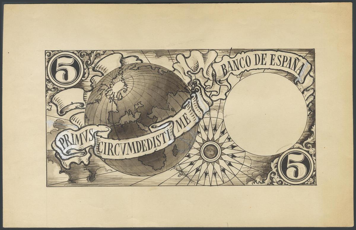(1948ca). Proyecto de un billete de 5 Pesetas. No tenemos suficiente información para datarlo, aunque por el estilo, arte, valor facial y proporciones de la prueba se entiende que es una propuesta no adoptada del reverso de 5 pesetas de 1948 dedicado a Juan Sebastián Elcano, puesto que el motivo principal de diseño es el globo terráqueo y el lema que aparecen en la cimera del escudo de armas del navegante vasco. Por ello, consideramos que el proyecto sería ejecutado en torno a 1946-1948. Interesante y único, inédito hasta la fecha.