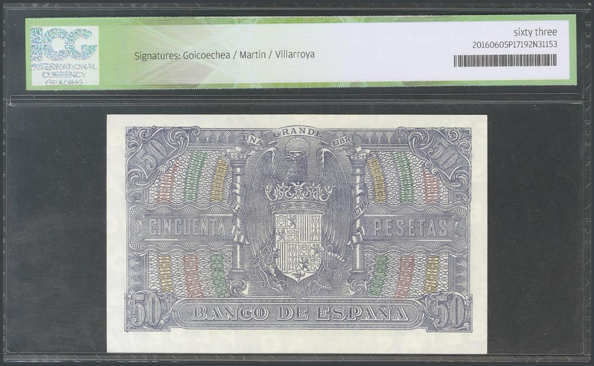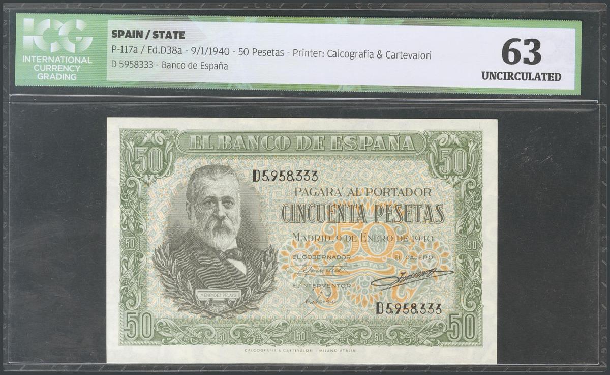 50 Pesetas. 9 de Enero de 1940. Serie D. (Edifil 2017: 437a). Encapsulado ICG63. SC.