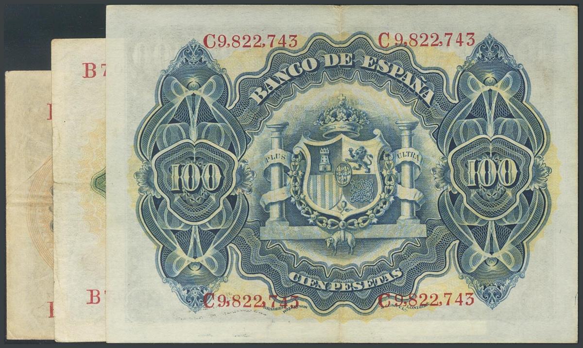 25 Pesetas, 50 Pesetas y 100 Pesetas. 24 de Septiembre de 1907 y 30 de Junio de 1907, respectivamente. Serie B (2) y C. (Edifil 2017: 313a, 314a, 315a). MBC.