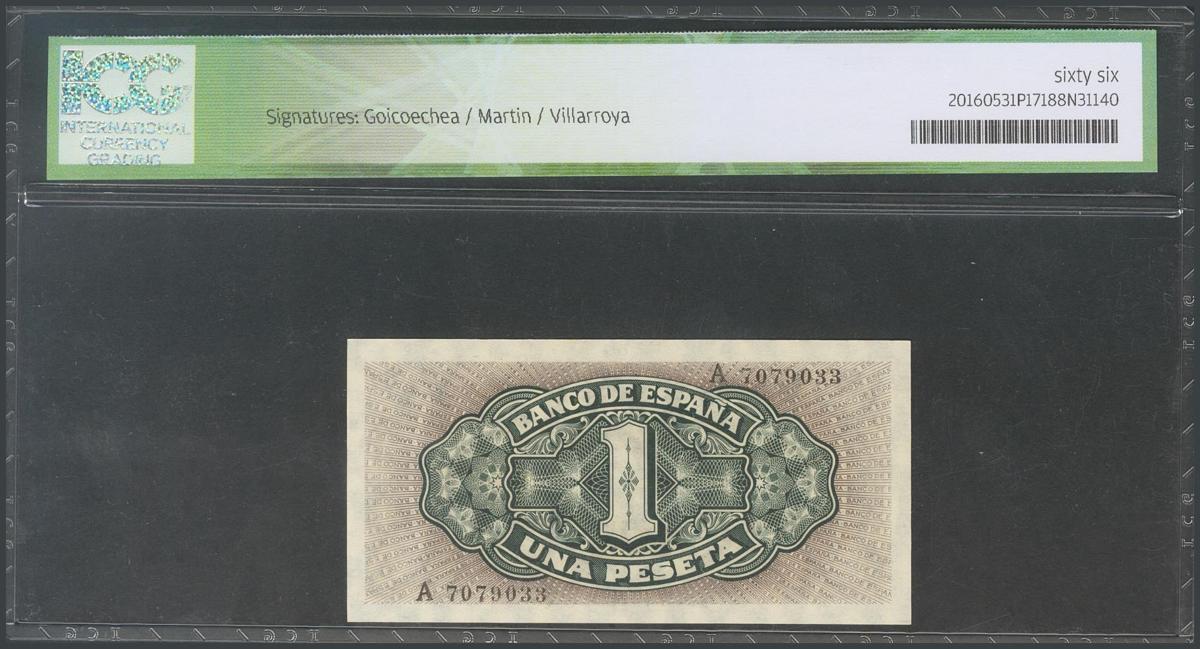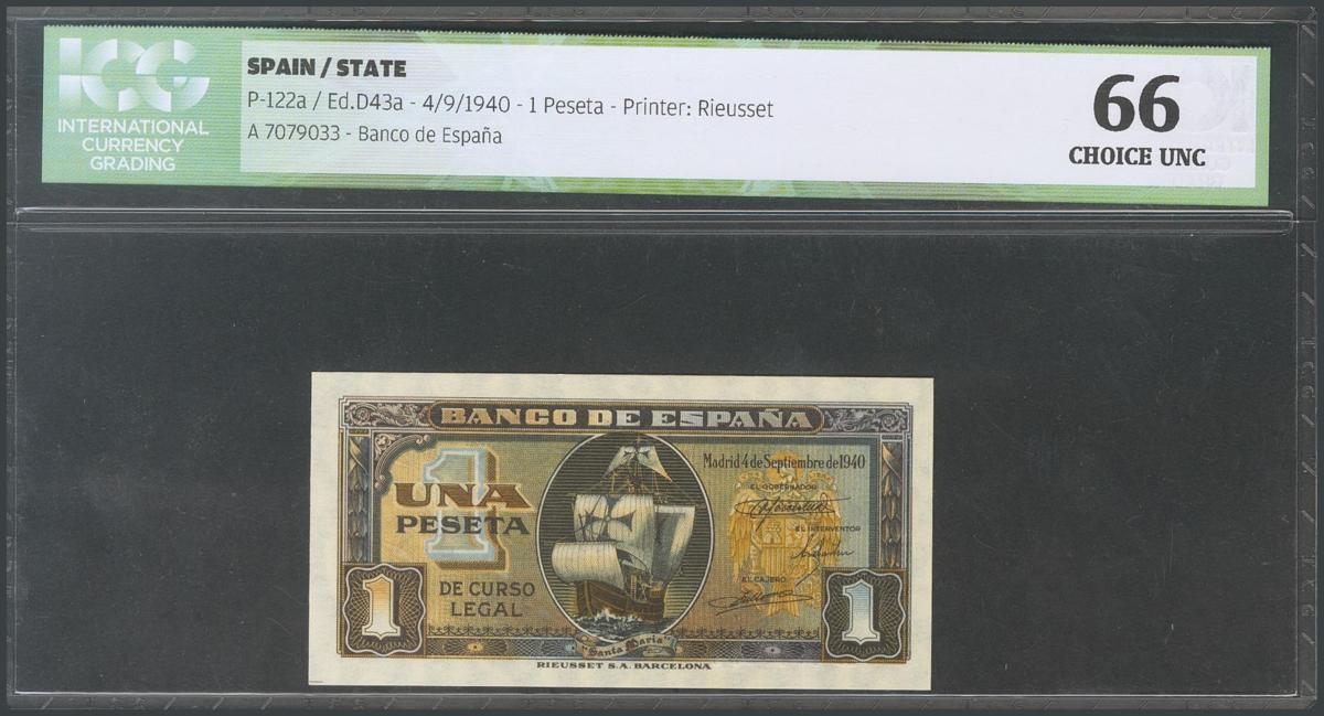 1 Peseta. 4 de Septiembre de 1940. Serie A. (Edifil 2017: 442a). Encapsulado ICG66. SC.