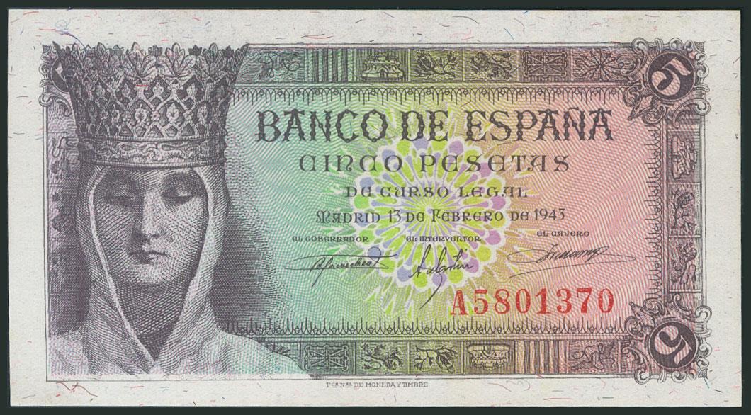 5 Pesetas. 13 de Febrero de 1943. Serie A. (Edifil 2017: 446a). SC.