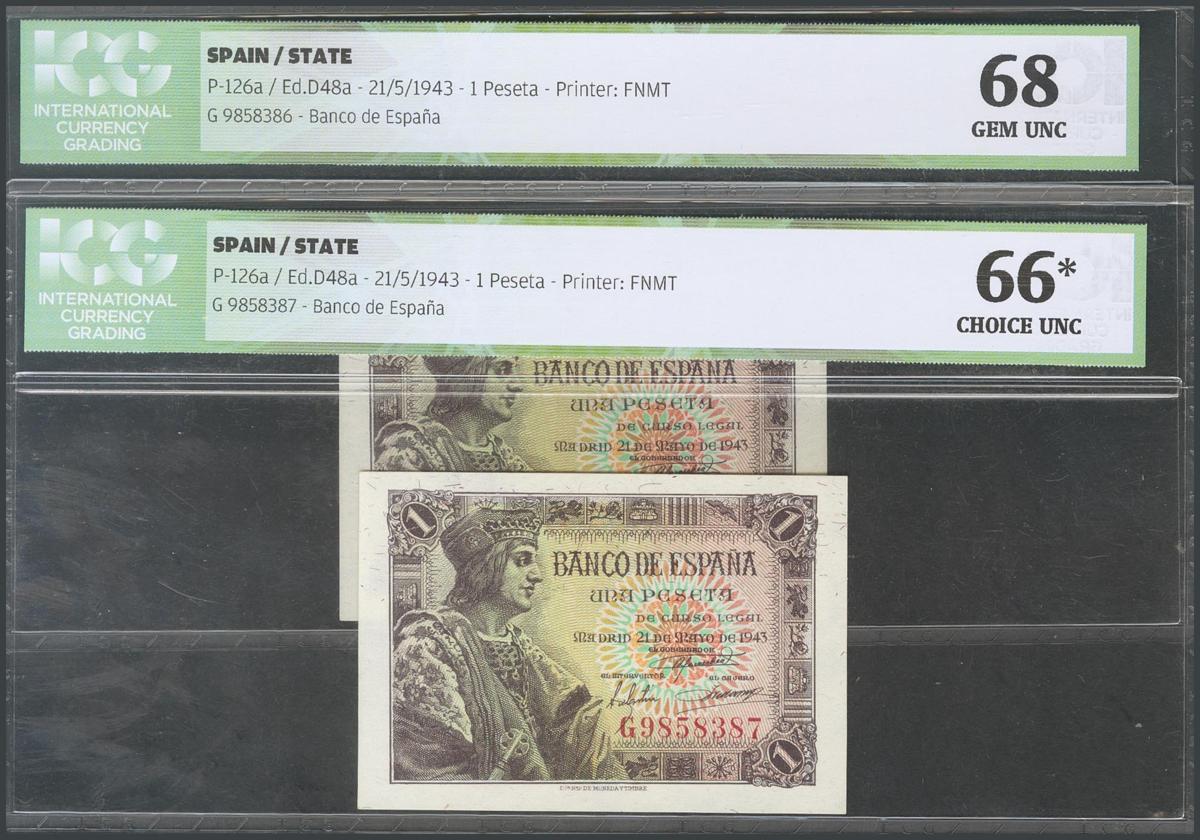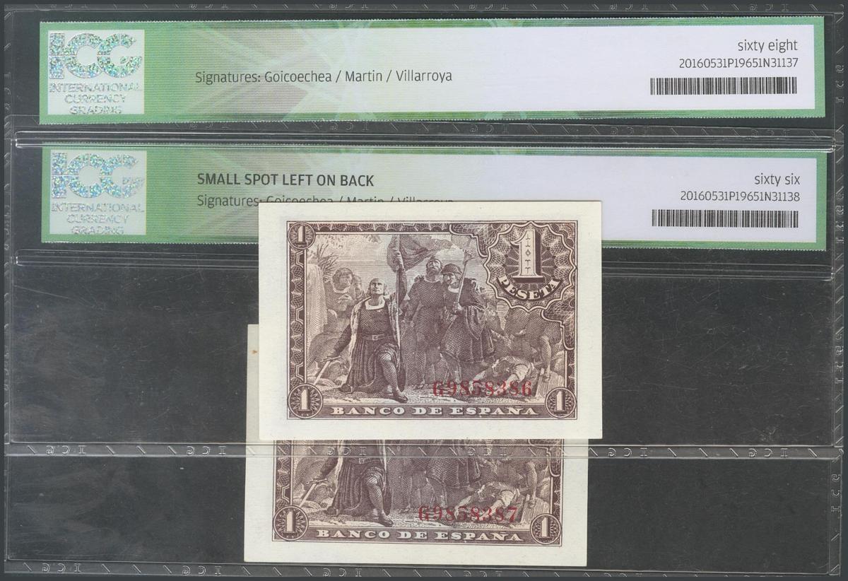 1 Peseta. 21 de Mayo de 1943. Pareja correlativa. Serie G. (Edifil 2017: 447a). Encapsulados ICG68 y 66 (el billete de graduación 66, mínimo puntito al dorso), respectivamente. SC.