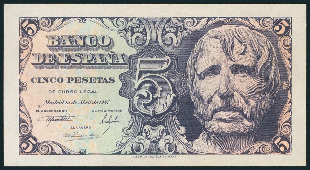 5 Pesetas. 12 de Abril de 1947. Serie A. (Edifil 2017: 454a). EBC+.