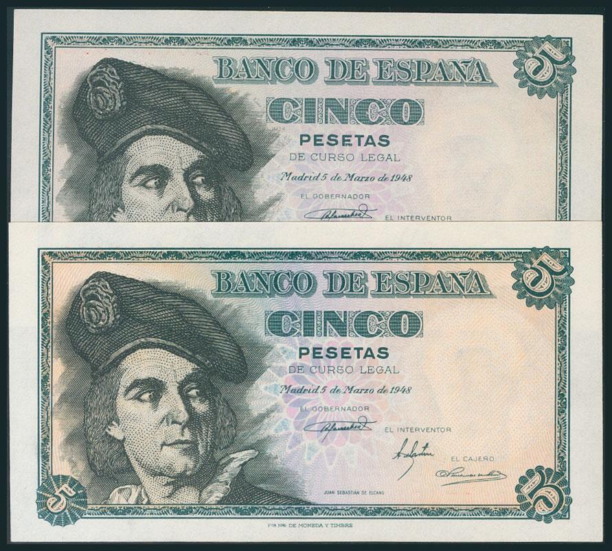 Conjunto de 2 billetes de 5 Pesetas emitido el 5 de Marzo de 1948 con las series A y E, respectivamente (Edifil 2017: 455a). SC.