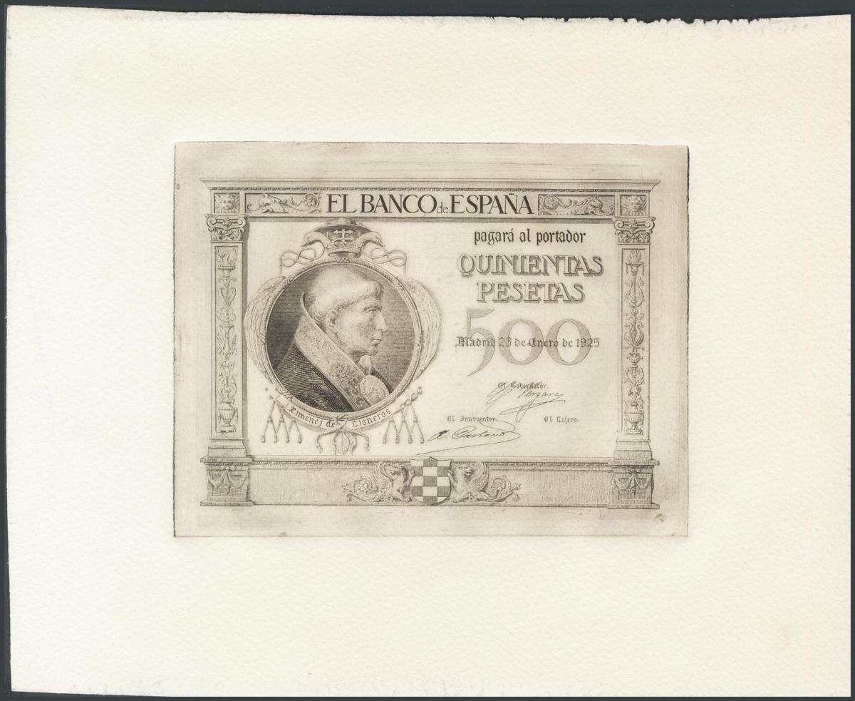 500 Pesetas. 25 de Enero de 1925. Prueba de anverso en color negro de un billete no emitido dedicado al Cardenal Cisneros. Rara. SC.