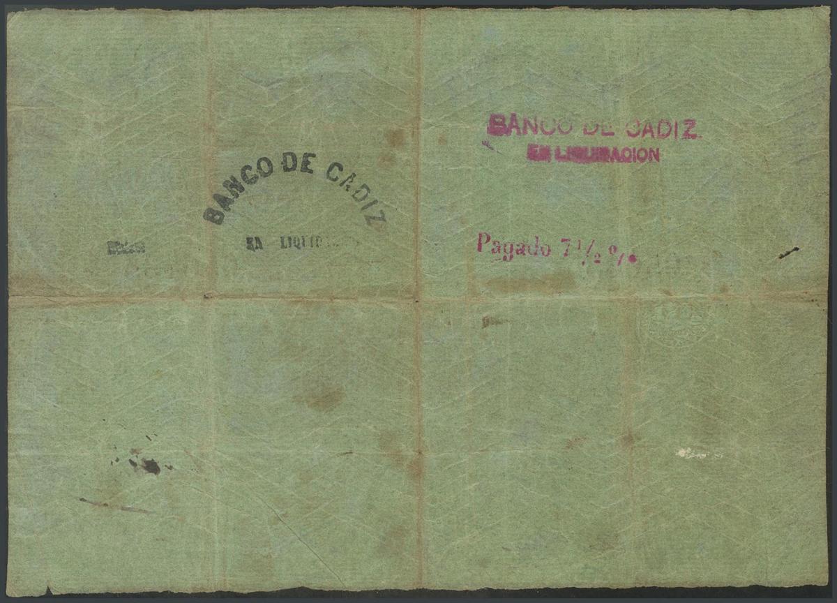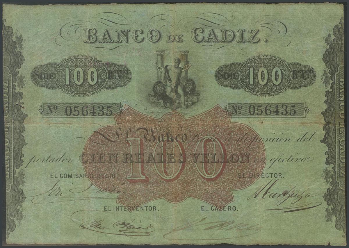 100 Reales. 10 de Noviembre de 1856. Banco de Cádiz, emisión II. Cifra central en rojo. (Edifil 2017: 76). Inusual. MBC+.